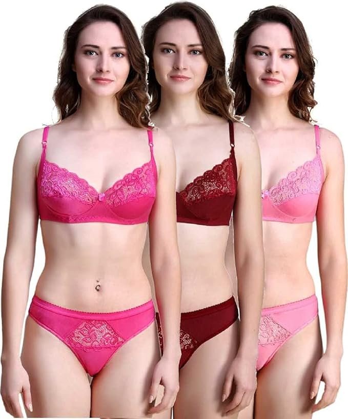 KARIKAR Women’s Stylish Lace Bra & Panty Set (Pack of 3 Colors – Pink, Dark Pink, Maroon)